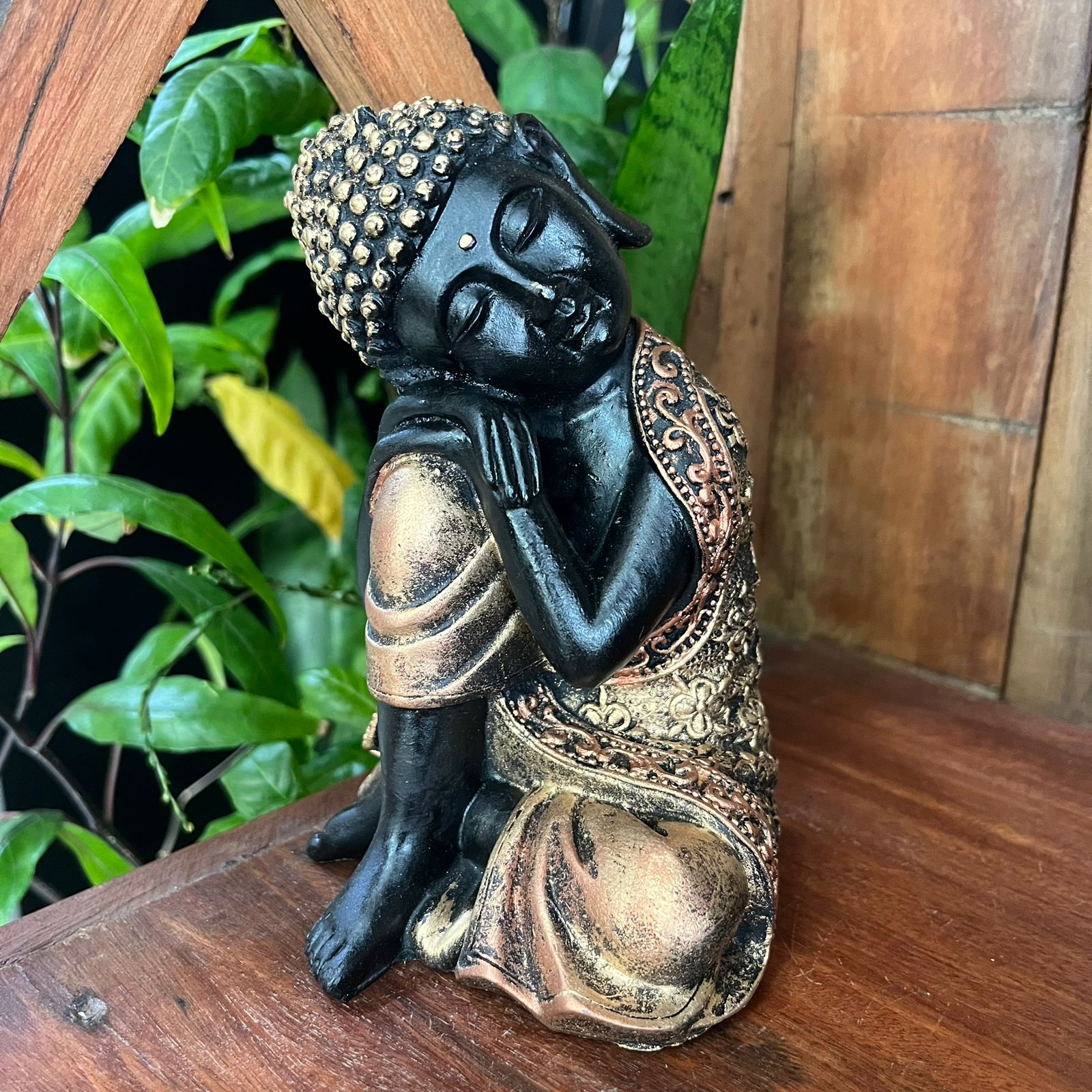O Buda quando está apoiado com a cabeça no joelho, representa a paz e a serenidade. É uma posição de descanso e tranquilidade.