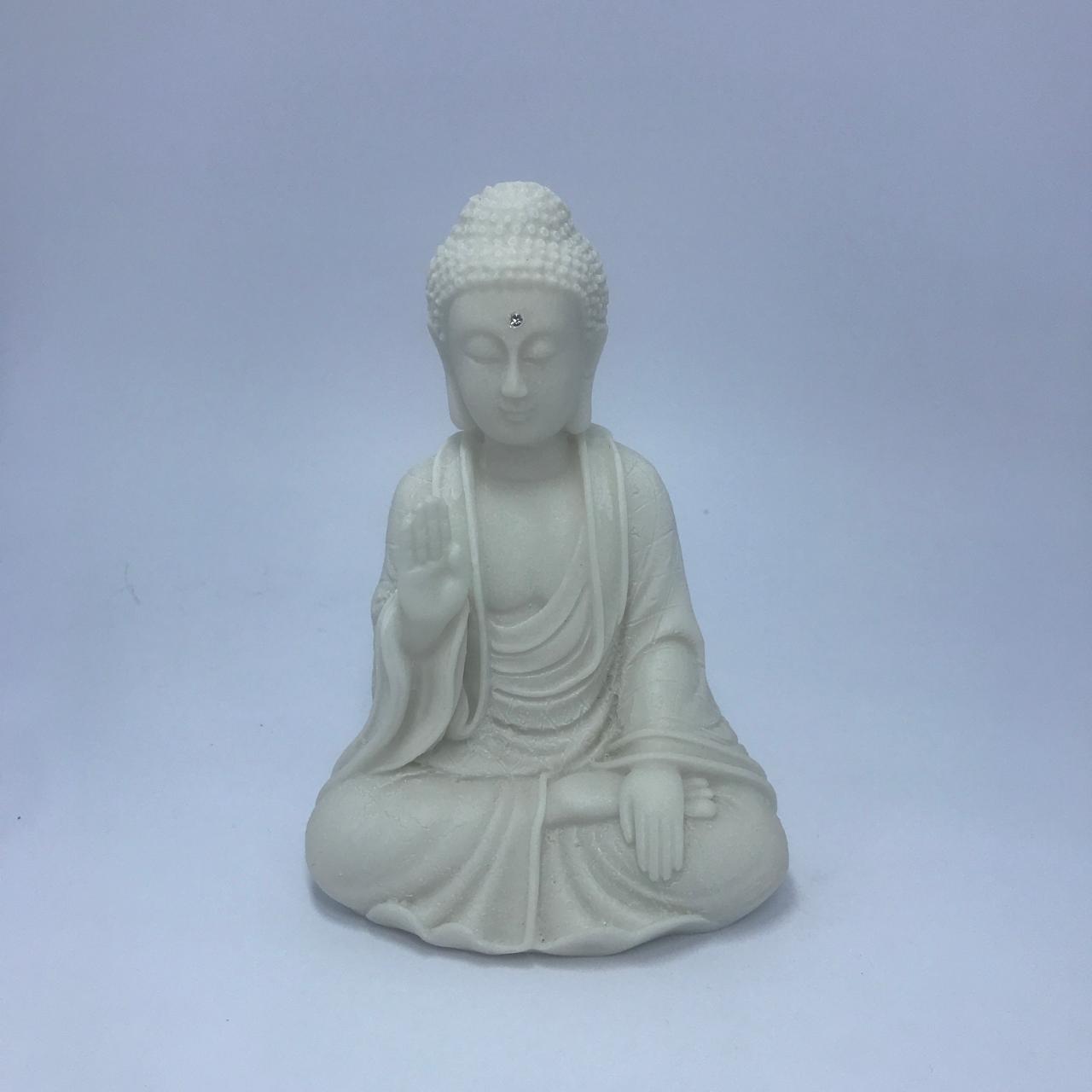 Este Buda está com o Abhaya Mudra, que é o mudra da bênção, paz, destemor, proteção e dissipação do medo. A mão direita, mantida na altura dos ombros, aponta para cima com a palma voltada para fora.