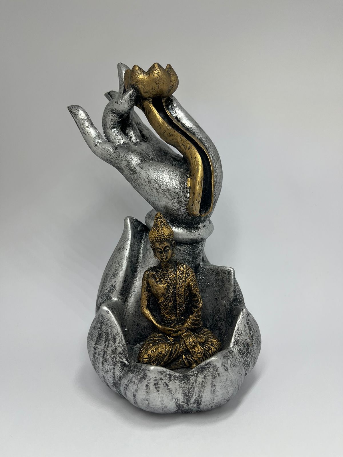 Incensário cascata Flor de Lótus com Buda feito em resina.