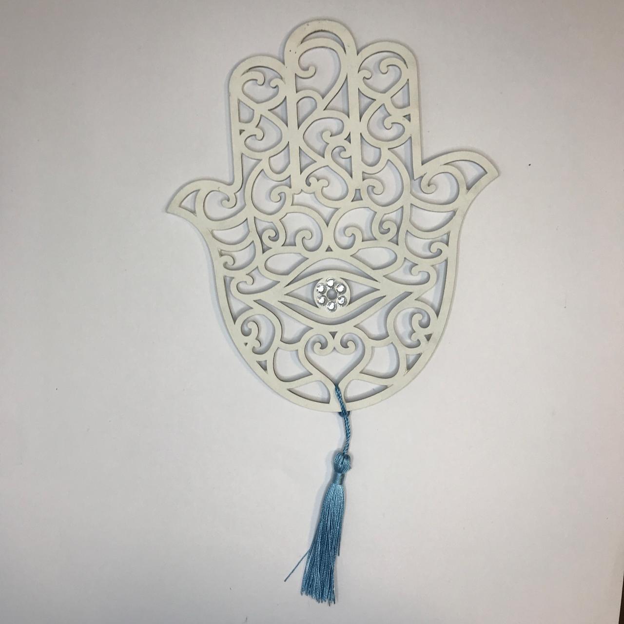 A mão Hamsá, também conhecida como mão de Fátima ou mão de Deus, é um amuleto de origem árabe e judaica que representa a palma da mão com cinco dedos estendidos. É um símbolo de fé, proteção, força e poder, e é usado para afastar energias negativas, mau-olhado, inveja e acidentes. Também é acreditado que a mão Hamsá traz sorte, felicidade e prosperidade.