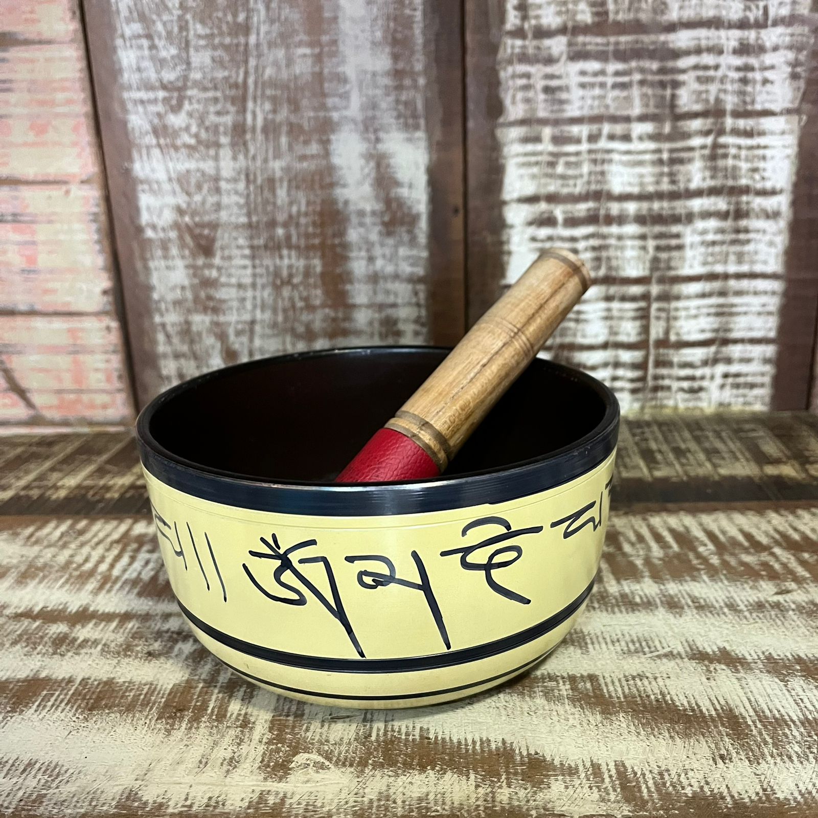 Acompanha 2 peças: Tigela (metal) e bastão (madeira).